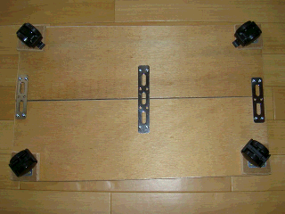 尚、両端のステーは2枚で、中央のステーは1枚100円(ダイソー)だったと思われ、2個で100円のキャスターと合わせて約400円(両端2枚だとヤワ、中央も同じサイズでも良かったかもしれないが、手持ちがなかった)。