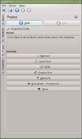 インストール後、起動させたら、見慣れたQtEmuの画面が現れ、設定後、起動しようと思ったら、仮想マシン画面が表示されない。。。なぜ?と思ったら、起動コマンドの変更が必要であることがわかりました。