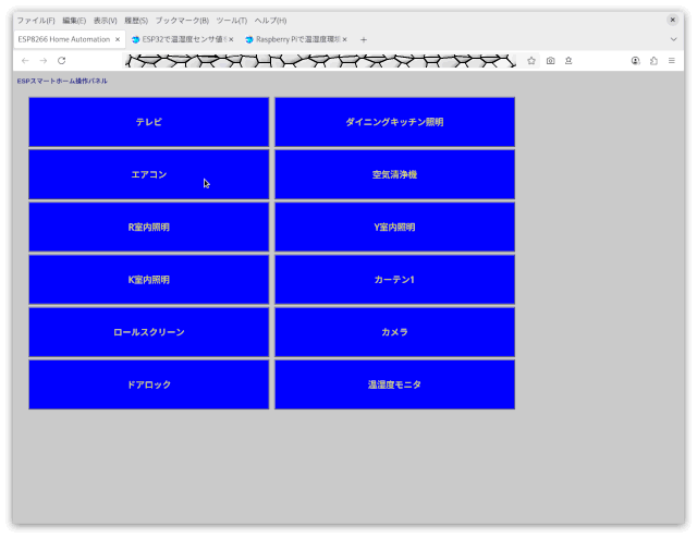 Wi-Fi・ブラウザを介したドアロック・アンロックボタンは、宅内から、もしくはVPN経由で外出先からロック状態の確認を主としてロック・アンロックボタンを映像・ストリミーング、スマート機器用操作パネルホームへのボタンと共にESP32カメラWebサーバ上に実装、ドアロック用ESP32ボードをWebsocketサーバとしてESP32カメラサーバ上のボタン押下時にWebsocket通信することで認証なし、同様の機構で施錠・解錠。