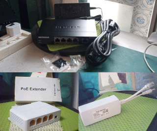 親機・子機とも電源と通信をLANケーブル(CAT5e以上)1本で賄うことができるPoE(Power on Ethernet)を採用、PoE+(IEEE802.3af/IEEE802.3at)対応なPoEスイッチングハブ、PoEエクステンダ/中継・拡張機から、SBC、マイコンともにPoE非対応につき、PoE受信すべく、PoEスプリッタを採用したので給電・通信用の配線はテレビドアホン室内機・子機ともにシンプルでスッキリ。