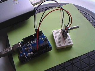 機能は若干異なるものの、図らずも汎用性があって、これもチルトセンサ用に作ったものと同じスケッチ、LED含め、ブレッドボード上も同じ配線で動作確認できました。(チルトと違ってLピンはない。)