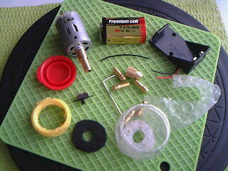 材料は、ミニペットボトル1本、ガラス瓶などの中蓋とキャップ(今回はプラスチック製)、ゴム板、DCモータ(今回使ったのは、操作電圧6V〜24V/15000〜18000rpm/シャフト径2.3mm)、ドリルビットセット(モータシャフト径2.3mm対応2.35mm)、ドリル刃(電動ドリル用)、スライドスイッチ、9V/006P電池ケース、9V/006P電池、プラスアルファ。