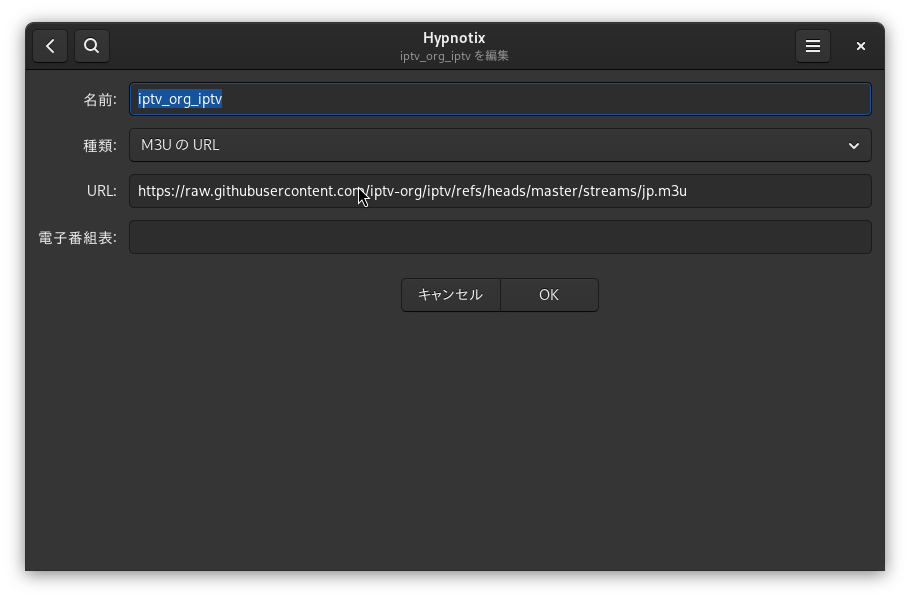URLには、外部ならgithubやredditなど比較的安全なサイトから得たチャンネルリストとなる*.m3uや*.m3u8(国別で日本なら例えば*.jp.m3uや*.jp.m3u.8)のようなファイルリストを入力するのが比較的安全でしょう。